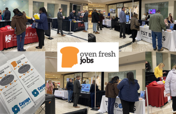 On Wednesday, March 4th, 2026, over 100 people attended the Oven Fresh Jobs Live Job Fair held by Cayuga Media Group. The one day (4 hour) hiring event was held at The Shops at Ithaca Mall from 9am to 1pm. 13 local companies participated in this excellent one-day event. These companies came from a variety of industries representing many job opportunities. These included medical, governmental, manufacturing, engineering, sales, education, and more.